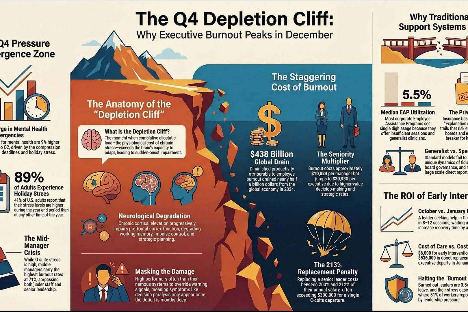 Standard mental health infrastructure was never designed for this population. Employee Assistance Programs offer six sessions with generalist clinicians who may not understand the difference between digital fatigue and ordinary stress. Insurance-based therapy introduces privacy risks through Explanation of Benefits statements visible to employers. Scheduling constraints make weekly in-person sessions nearly impossible for executives managing global teams. This systematic mismatch is precisely why concierge private-pay telehealth exists — and why CEREVITY built its practice around the specific psychological needs of leaders who cannot afford to be seen as struggling.
